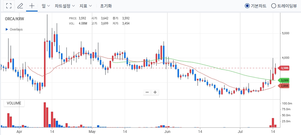 - 가격 흐름: 2025년 7월 15일 기준 ORCA/KRW는 3,592원에 마감했으며, 최근 거래량이 급증하면서 단기 상승세가 뚜렷하게 나타나고 있습니다.